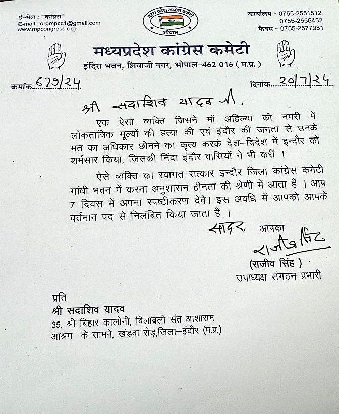भोपाल: कांग्रेस कार्यालय में प्रदेश सरकार के मंत्री विजयवर्गीय का स्वागत करना और मिठाई खिलाना कांग्रेस के दो पदाधिकारियों और नेताओं को भारी पड गया। पहले तो प्रदेश कांग्रेस कमेटी ने उन्हें नोटिस जारी किया और सात दिन के भीतर जवाब न देने के लिए कहा गया है। इस मामले में दोनों नेताओं का कहना है कि उन्हें नोटिस नहीं मिला है जबकि ये नोटिस बीस जुलाई को ही जारी किया जा चुका था। इन सात दिनों के अंतराल में दोनों को पद से निलंबित करने के लिए भी लिखा गया है। दोनों निलंबित दोनों नेताओं ने मीडिया से फिलहाल दूरी बना ली है। जानकारी के अनुसार व्रक्षारोपण वाले दिन मंत्री कैलाश विजयवर्गीय कांग्रेस कार्यालय पहुंचे थे, वहां पर उनका स्वागत कर इन दो नेताओं ने मिठाई भी खिलाई थी। इसके बाद प्रदेश कांग्रेस कमेटी एक्शन में आ गई थी। कमेटी ने पहले तो इन दो नेता सदाशिव यादव और शहर अध्यक्ष सुरजीत चड्डा को नोटिस जारी कर सात दिनों के भीतर जवाब देने के लिए कहा था। इसमें अनुशासनहीनता कारण बताया गया था। बताया जा रहा है कि दोनों नेताओं को कांग्रेस के संगठन प्रभारी राजीव सिंह ने नोटिस जारी किया था। फिलहाल दोनों को पद से हटाया गया है। इस मामले में कांग्रेस के प्रदेश स्तर के वरिष्ठ नेताओं ने अभी तक कोई प्रतिक्रिया नहीं दी है। बहरहाल नोटिस दिए जाने के इस मामले ने कांग्रेस में हलचल मचा दी है। अब इस बात का इंतजार किया जा रहा है कि आगे कांग्रेस इन दो नेताओं को लेकर क्या एक्शन लेगी।